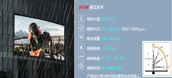 与IP65相比,IP69K是更高维度的防护测试,更贴近户外显示屏的实际应用,客户即使在盐雾或高温环境下也不用担心USMⅣ的运行状态.